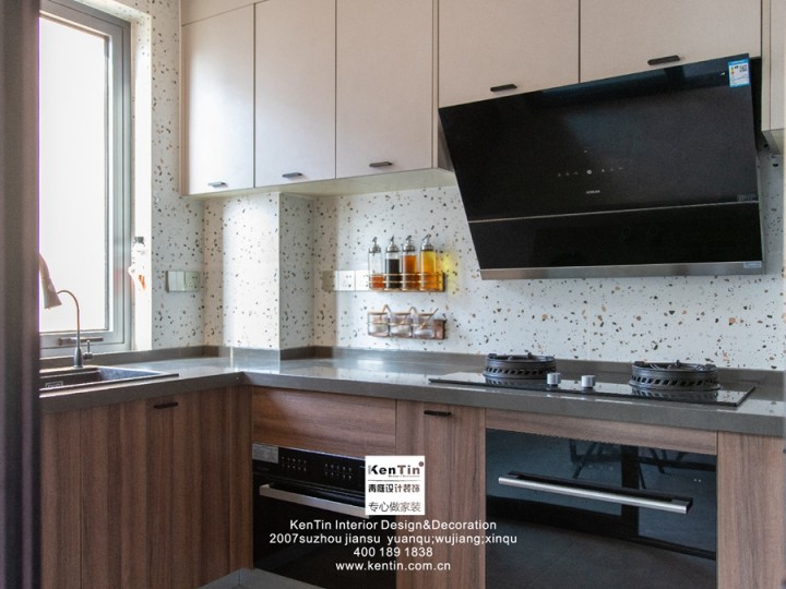 廚房原木櫥柜典雅自然,內嵌的廚具不占空間;灰色大理石臺面干凈易于清理,墻壁上的置物架讓桌面井井有條,騰出更多烹飪空間。