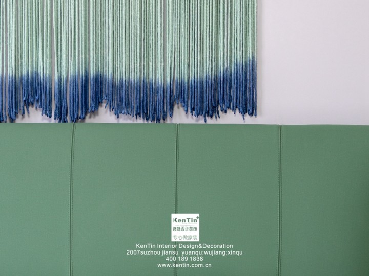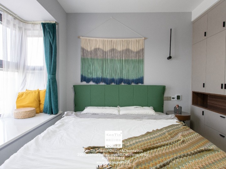 新家的臥室以溫馨舒適為主,床靠背柔軟,靠上去格外放松。不同房間的背景墻都做了精心的布置。富有特色的扎染工藝品情調非常,是自然又質樸的畫作。