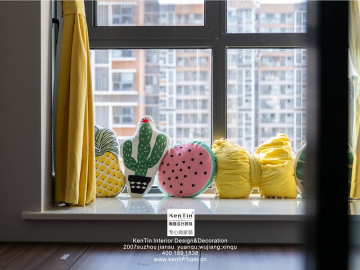 書房的榻榻米可以變身儲藏柜,平時可以用來儲物,鋪上床品就能變成一個小臥室。床靠背卡通可愛,陽臺擺滿漂亮的抱枕,意趣十足,以后也可以作為兒童房使用。