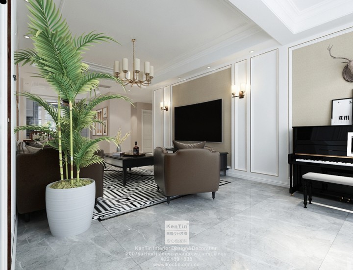 客廳里的線條簡潔明朗,經典的黑白家具,搭配淺咖色墻壁,將美式的大氣與溫馨表現得淋漓盡致。空間里的動物元素裝飾和大株的植物,都增添了滿滿的自然氣息。大落地窗前,騰出一片空間作為琴房。